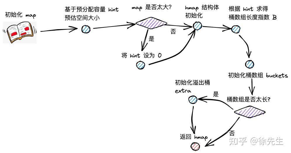 (1)hint 为 map 拟分配的容量;在分配前,会提前对拟分配的内存大小进行判断,倘若超限,会将 hint 置为零;