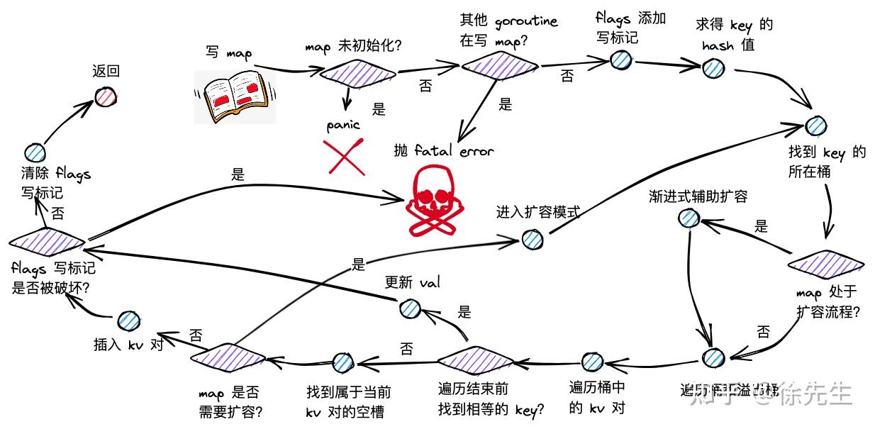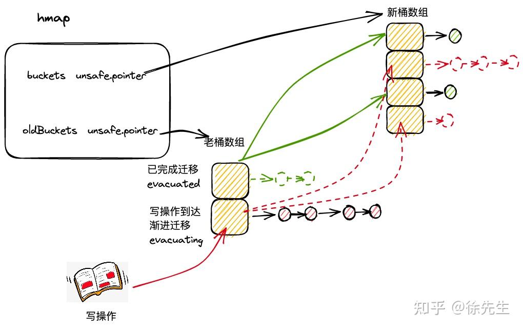 当每次触发写、删操作时,会为处于扩容流程中的 map 完成两组桶的数据迁移: