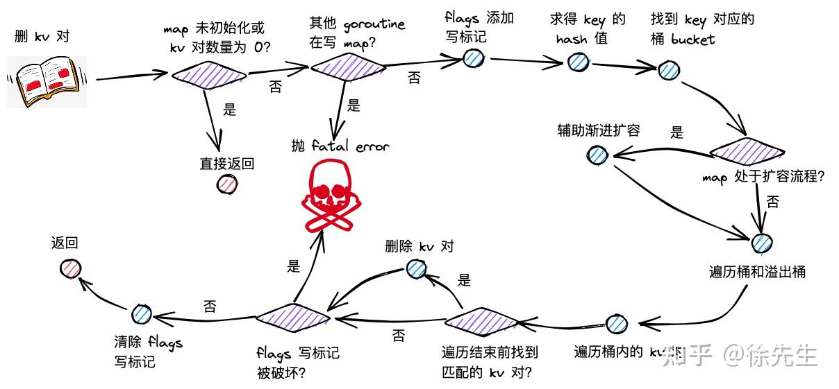 func mapdelete(t *maptype, h *hmap, key unsafe.Pointer) { if h == nil || h.count == 0 { return } if h.flags&hashWriting != 0 { fatal("concurrent map writes") }