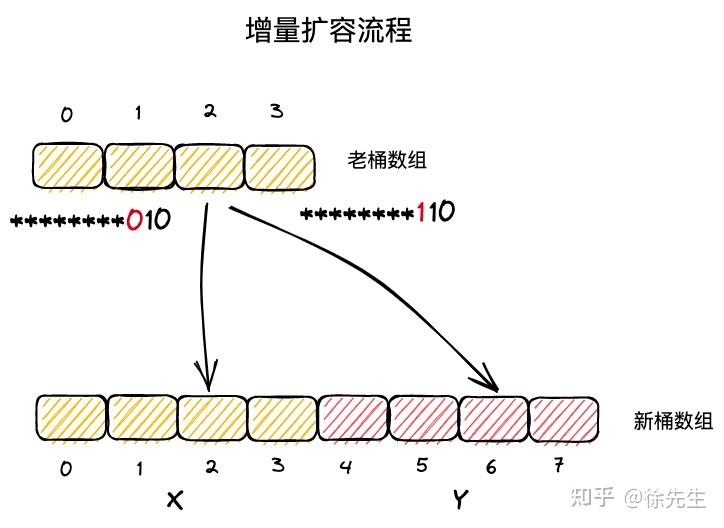 (6)在增量扩容流程中,新桶数组的长度会扩展一位,假定 key 原本从属的桶号为 i,则在新桶数组中从属的桶号只可能是 i (x 区域)或者 i + 老桶数组长度(y 区域);